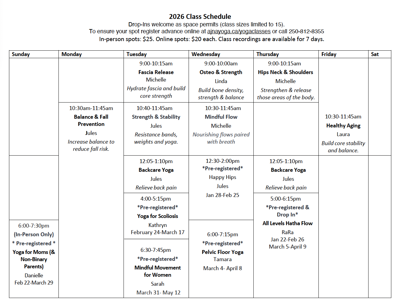 Drop-ins are welcome as space permits (class sizes limited to 15), or register in advance to ensure your spot.